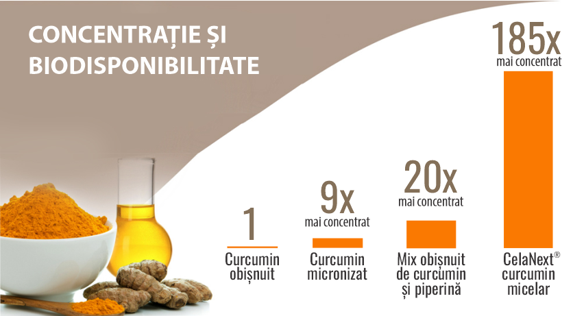 Contine extract micelar de curcumin cu o biodisponibilitate de 185X mai puternica decat un extract obisnuit de curcumin, de 20X mai puternica decat curcumin micronizat si de 9X mai puternica decat un amestec obisnuit de curcumin si piperina.