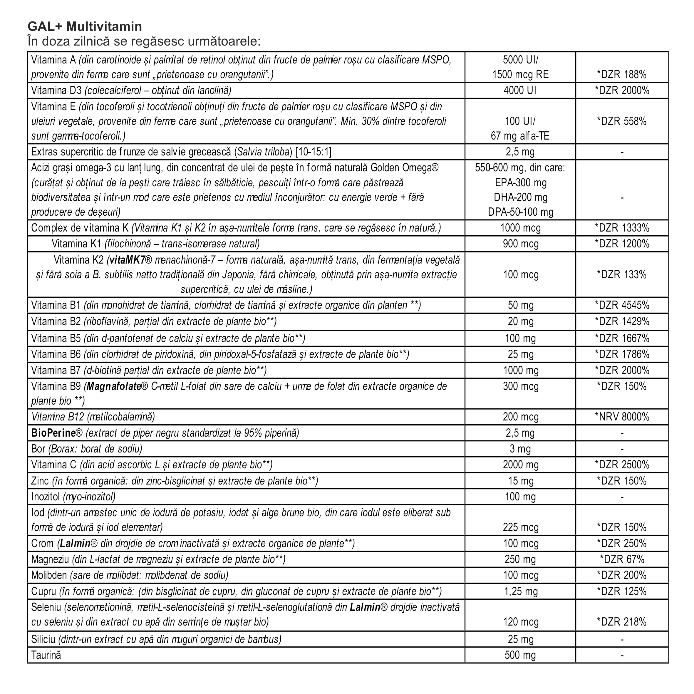 Produsul GAL + Multivitamin a fost dezvoltat în baza celor mai recente cercetări, încercându-se realizarea unui produs cât mai apropiat de natural. Asta înseamnă că acesta conține – într-o formă, cu o cantitate și cu o proporție ideală – toate vitaminele, mineralele și oligoelementele pe care le-am putea obține cu o dietă variată și care ar fi în mod constant bogată în nutrienți. Toate aceste ingrediente active se regăsesc în natură, iar o parte semnificativă dintre ele sunt extrase din plante medicinale și plante aromatice (bio) provenite din culturi organice. Așadar, conțin și co-factori care se regăsesc – în mod probabil deloc accidental – în aceste plante, pe lângă vitaminele și mineralele pe care le conțin. În ceea ce privește cantitățile, am considerat că este important ca doza zilnică să conțină în mod cert doza considerată a fi eficientă. Dar să nu depășească, în niciun caz, cantitățile care ar putea fi obținute în mod natural, adică niște cantități care nu ar mai putea fi obținute doar prin alimentație. În plus, este extrem de important, că pe lângă ingredientele atent selectate, nu există nici un ingredient care nu are ce căuta în el. În produsul nostru nu există nici urmă de așa ceva.