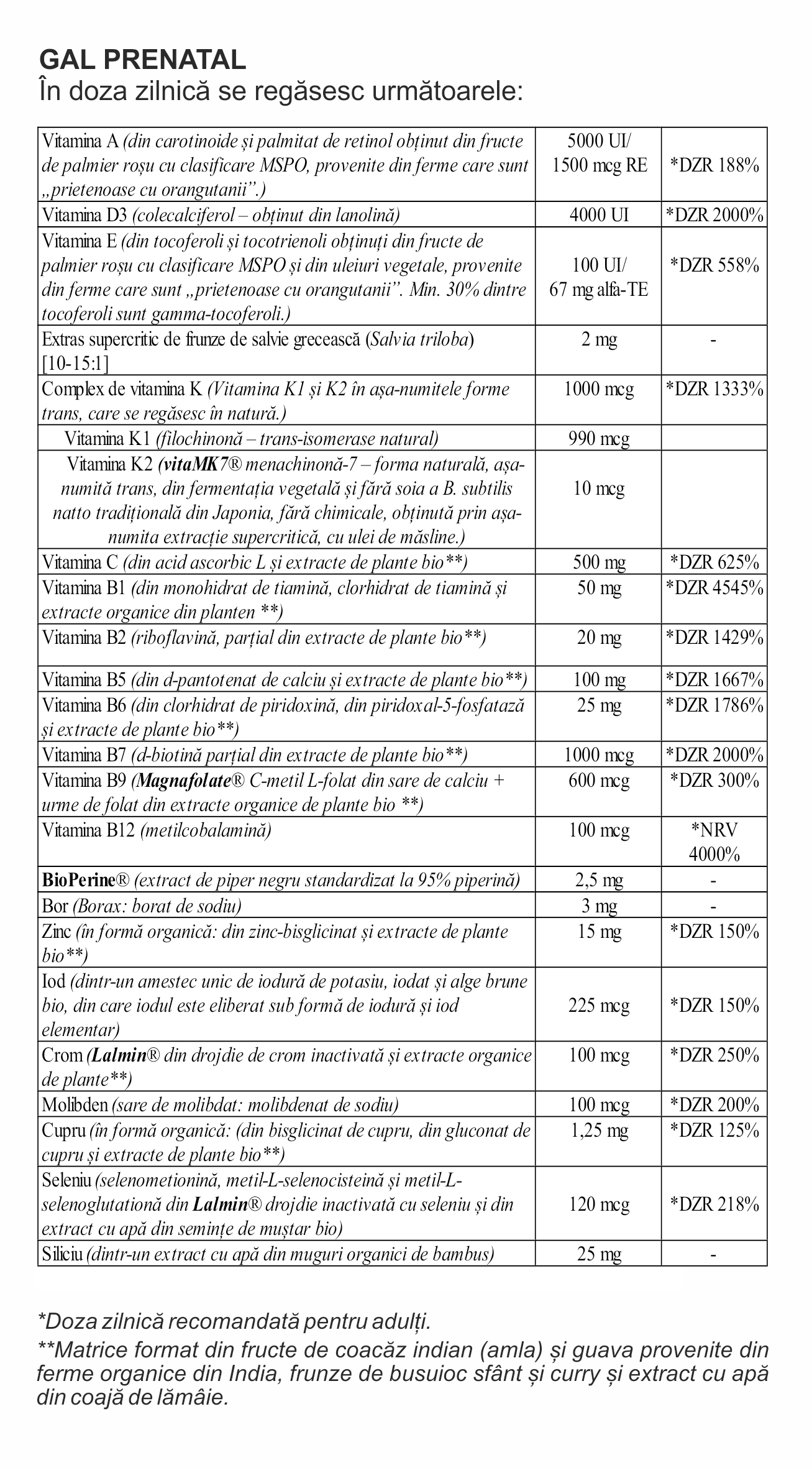 Produsul GAL Prenatal a fost dezvoltat în baza celor mai recente cercetări, încercându-se realizarea unui produs cât mai apropiat de natural. Asta înseamnă că acesta conține – într-o formă, cu o cantitate și cu o proporție ideală – toate vitaminele, mineralele și oligoelementele pe care le-am putea obține cu o dietă variată și care ar fi în mod constant bogată în nutrienți. Toate aceste ingrediente active se regăsesc în natură, iar o parte semnificativă dintre ele sunt extrase din plante medicinale și plante aromatice (bio) provenite din culturi organice. În ceea ce privește cantitățile, am considerat că este important ca doza zilnică să conțină în mod cert doza considerată a fi eficientă. Dar să nu depășească, în niciun caz, cantitățile care ar putea fi obținute în mod natural, adică niște cantități care nu ar mai putea fi obținute doar prin alimentație. În plus, este extrem de important ca dezvoltarea fără probleme a unei noi vieți să nu fie deranjată de vreun ingredient care nu are ce căuta într-un produs prenatal. În produsul nostru nu există nici urmă de așa ceva.