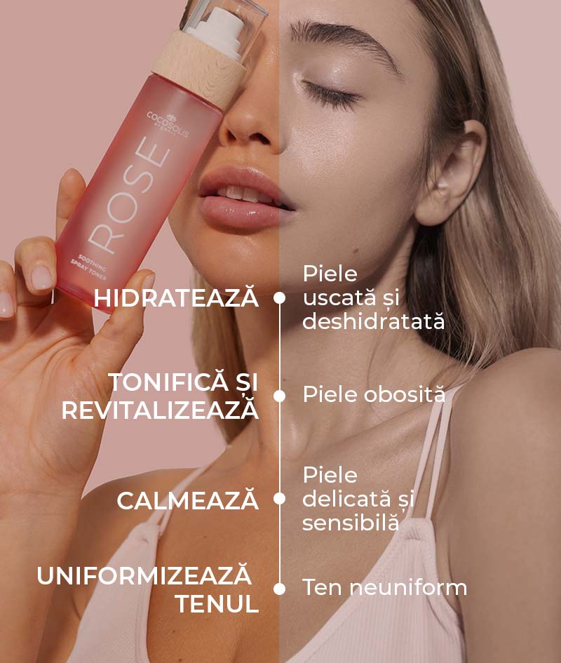 Bogată în antioxidanți și vitamine, apa de trandafiri îmbunătățește hidratarea și aspectul pielii. Are efect anti-îmbătrânire: reduce ridurile fine și porii, tonifiază și conferă luminozitate. Calmează.