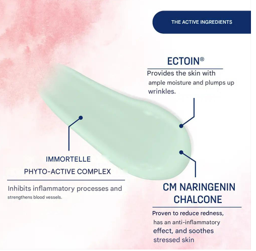 Pentru calmarea pielii reactive, formula include complexul Phyto-Active cu Helichrysum italicum (immortelle), care susține vasele de sânge și contribuie la reducerea roșeții și a iritației. CM-Naringenin Chalcone completează acțiunea prin efectul său antiinflamator, îmbunătățind vizibil uniformitatea tenului.