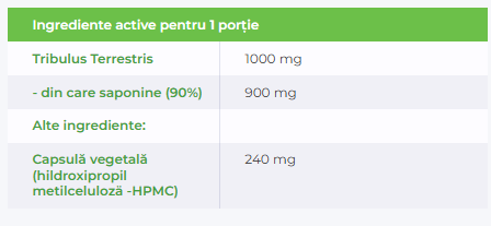 – Conțin 1000 mg de Tribulus Terrestris (Terrestris punctata) per porție, sub formă de extract standardizat, din care saponine 90%, 900 mg, acestea fiind principalii compuși bioactivi ai plantei;