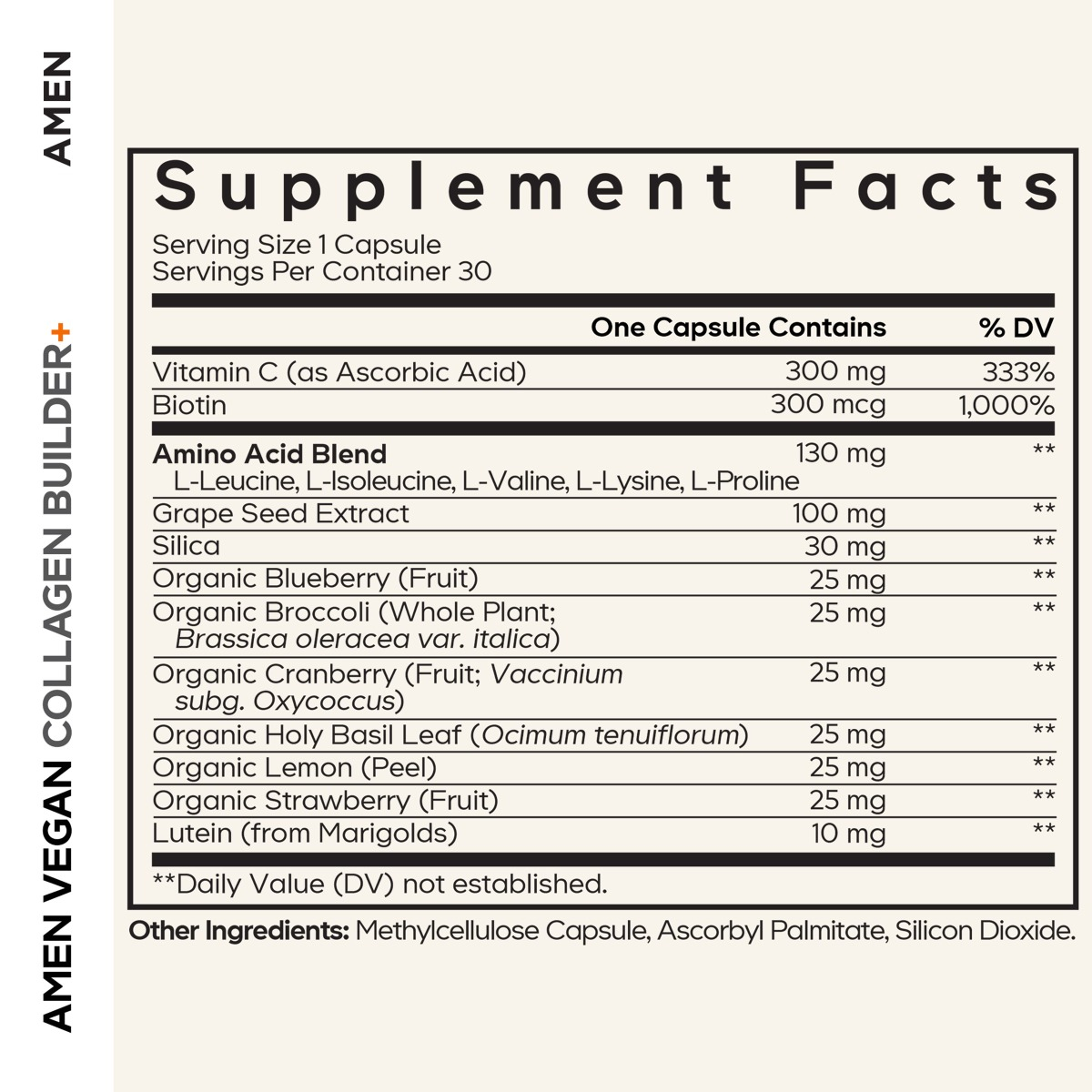 Amen Vegan Collagen Builder+ ofera un amestec avansat de vitamina C, biotina, luteina, aminoacizi si fructe si plante organice precum afine, merisoare, capsuni, coaja de lamaie, combinate cu extract de samburi de struguri, pentru a sustine productia naturala de colagen a organismului si a furniza antioxidanti. Acest supliment reprezinta o alternativa vegetala la colagenul derivat din surse animale.