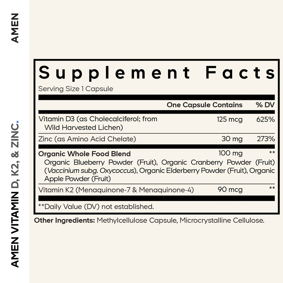 Amen Vitamin D, K2 si Zinc este o formula avansata cu vitamine, minerale si extracte din fructe organice, conceputa pentru a sustine imunitatea si sanatatea oaselor.