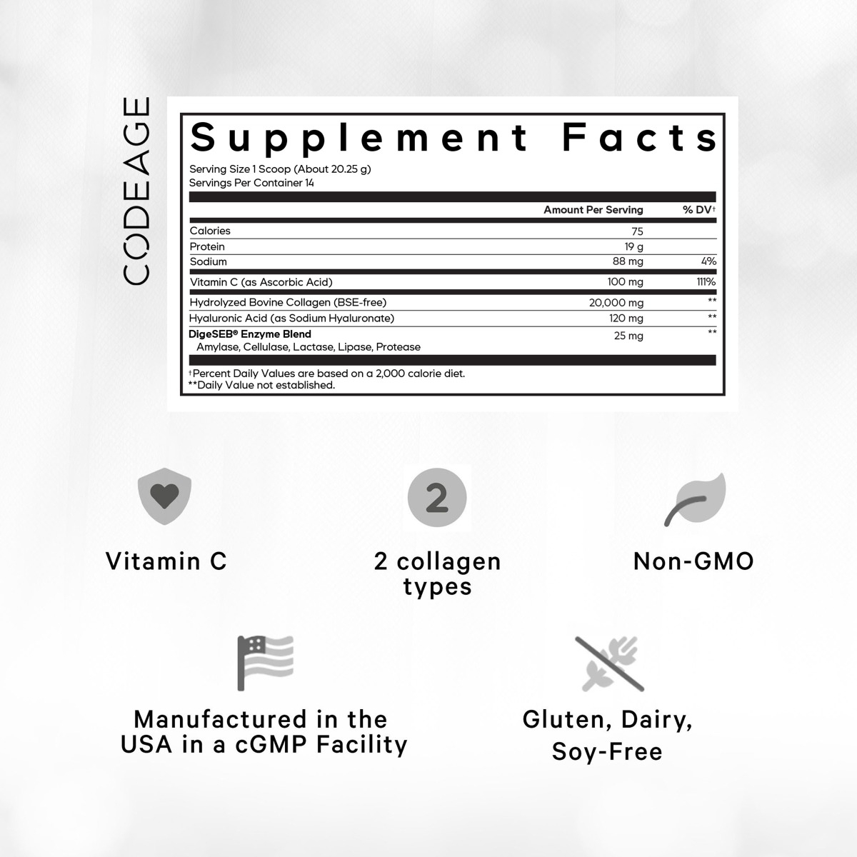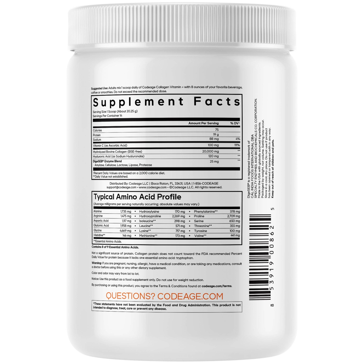 Codeage Collagen Vitamin C ofera 20g de colagen hidrolizat, provenit din carne de vita hranita cu iarba. Acesta este combinat cu vitamina C, acid hialuronic, 18 aminoacizi si enzime digestive, oferind o formula superioara pentru sanatatea pielii, parului, unghiilor si articulatiilor.
