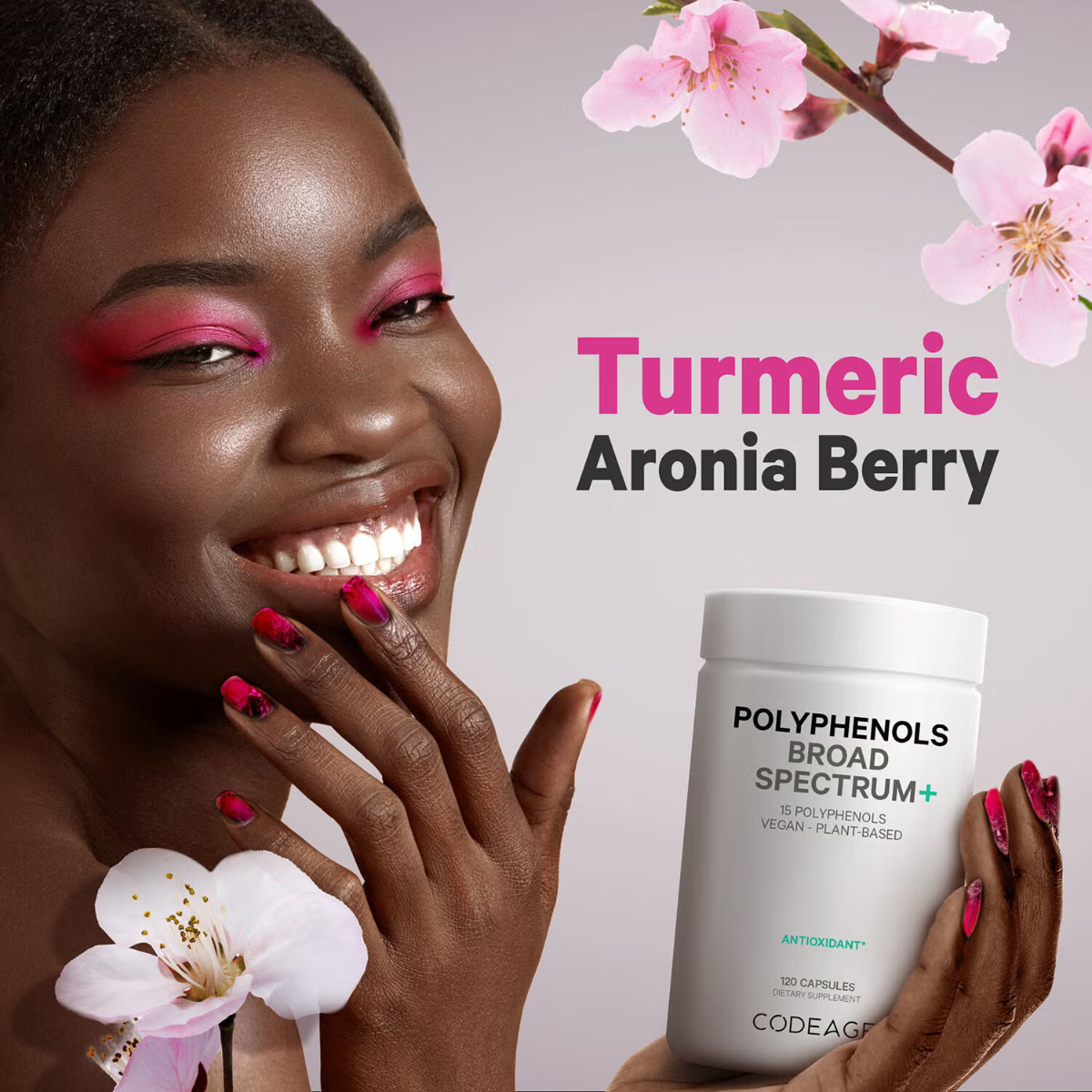 Codeage Polyphenols Broad Spectrum este un supliment premium care ofera un amestec cu spectru larg de polifenoli din surse botanice variate, conceput pentru a sustine sanatatea celulara, longevitatea si protectia impotriva stresului oxidativ.