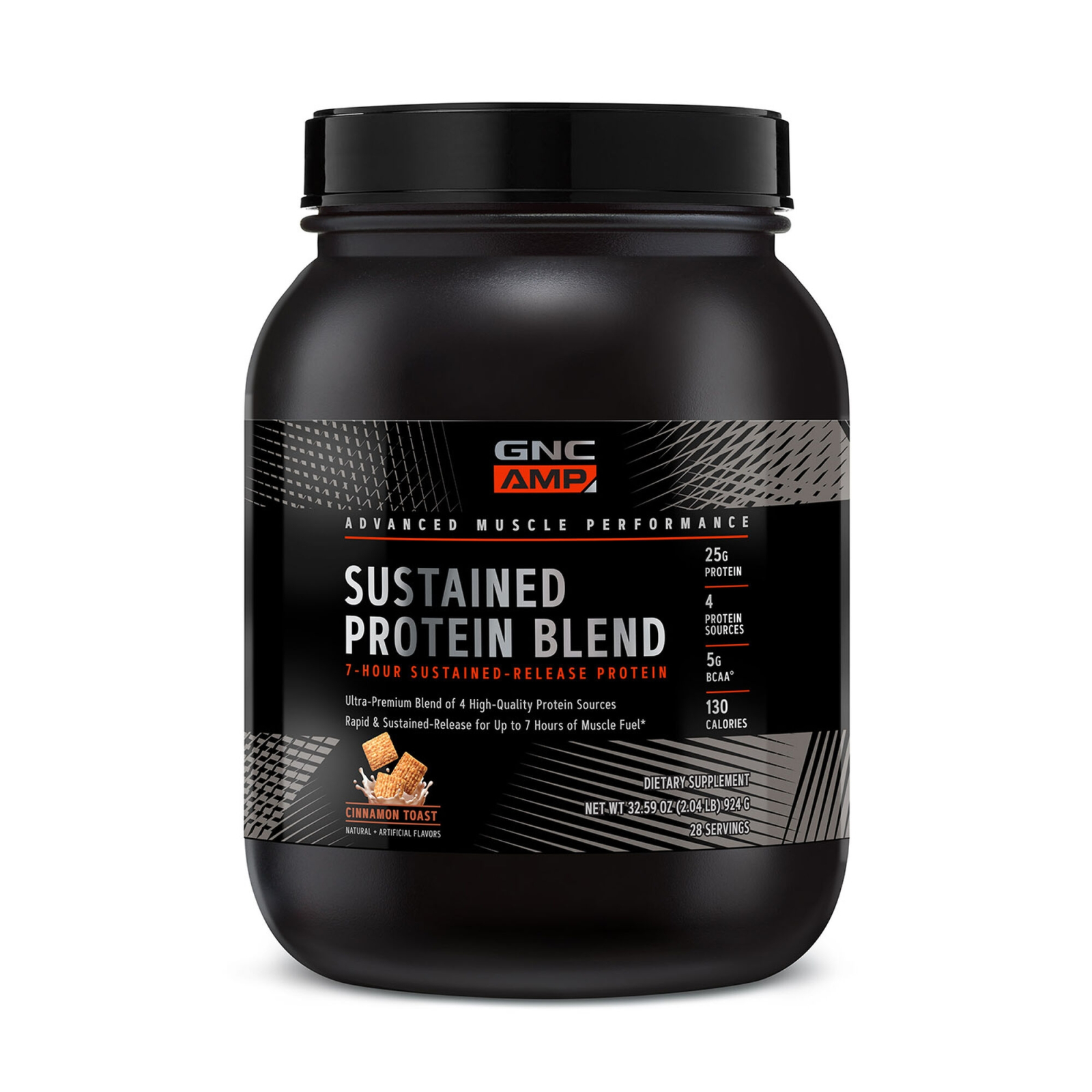 GNC AMP Sustained Protein Blend este un amestec proteic cu aroma de cereale cu scortisoara pentru sustinere, cu o eliberare treptata pe parcursul a 7 ore.