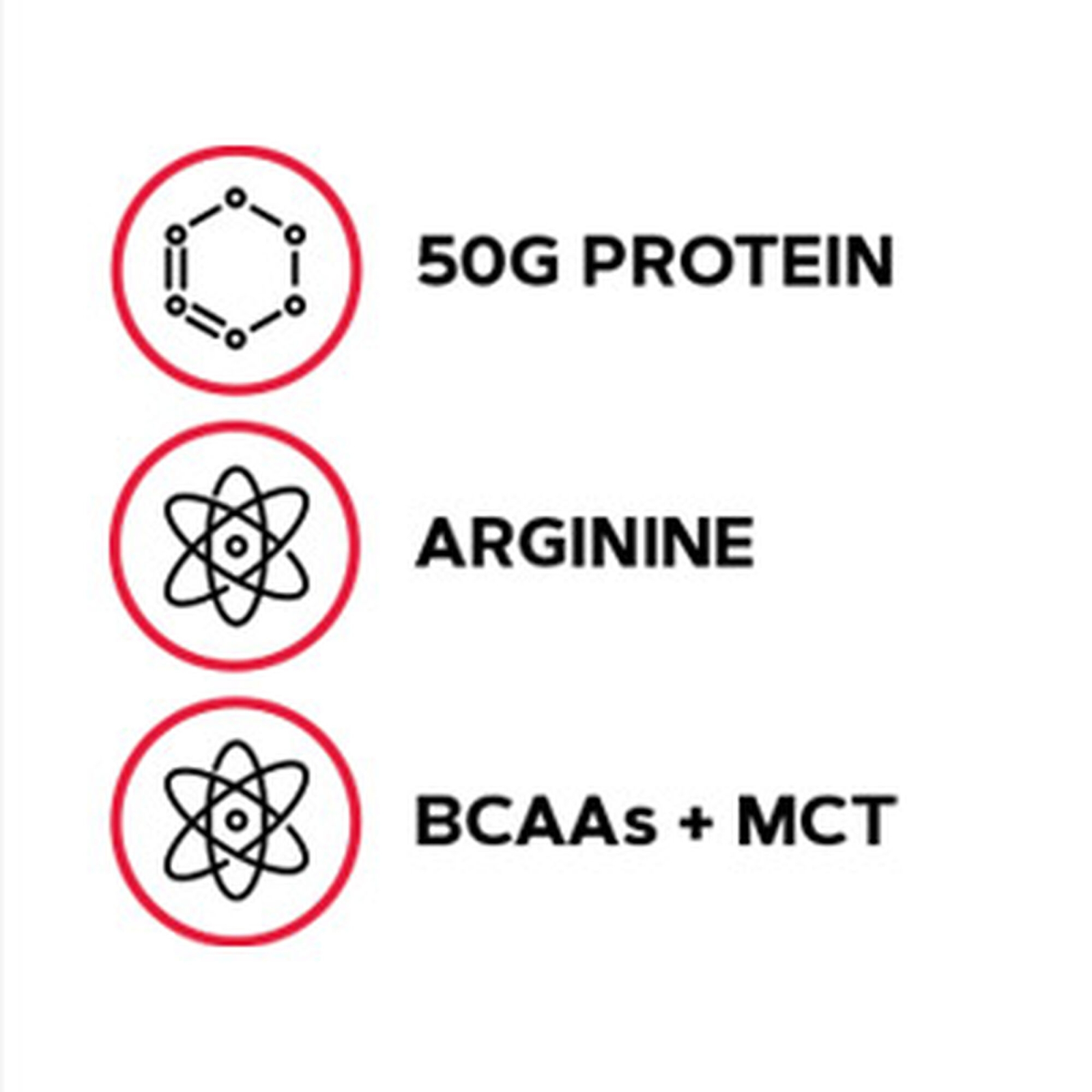 Alte ingrediente: maltodextrina, amestec brevetat proteic (concentrat proteic din zer, izolat proteic din soia, hidrolizat proteic din zer, concentrat proteic din lapte, izolat proteic din zer, cazeinat de calciu), polidextroza, arome naturale si artificiale, pudra din sfecla rosie (colorant), amestec de gume (guma din celuloza, guma xantan, caragenan), mct (trigliceride cu lant mediu), d-riboza, lecitina din soia, sucraloza, dioxid de siliciu.