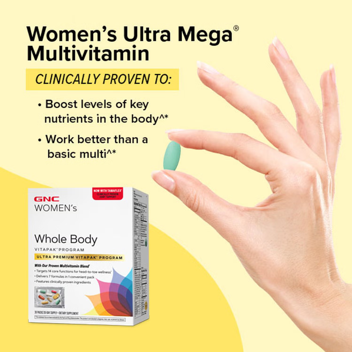 Beneficii totale pentru un corp sanatos si puternic! Programul Whole Body Vitapak® iti ofera cea mai buna formula de multivitamine pentru femei de la GNC, energizandu-te si sustinand sistemul imunitar, plus resveratrol ResVida™ pentru o circulatie sanatoasa.