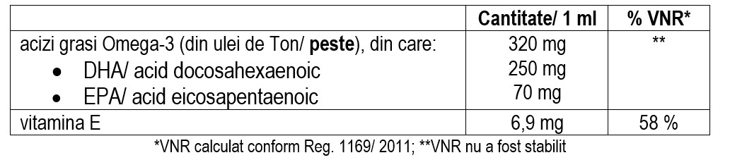 Ulei din TON (pește), bogat în acizi grași Omega-3 (78,12% DHA/ acid docosahexaenoic, 21,87% EPA/ acid eicosapentaenoic); ulei de lămâie; acetat de DL-alfa-tocoferil furnizand vitamina E; antioxidant: extract bogat în tocoferoli.