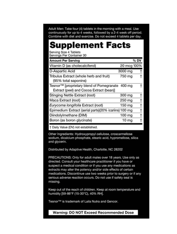 Ingrediente: Acid D-Aspartic, extract de tribulus, Tesnor®, extract de urzica, extract de maca, extract de Eurycoma Longifolia, extract de Epimedium, diindolilmetan, bor, vitamina D, hidroxipropil celuloza, croscarmeloza de sodiu, fosfat dicalcic, acid stearic, hipromeloza, dioxid de siliciu, glicerina.
