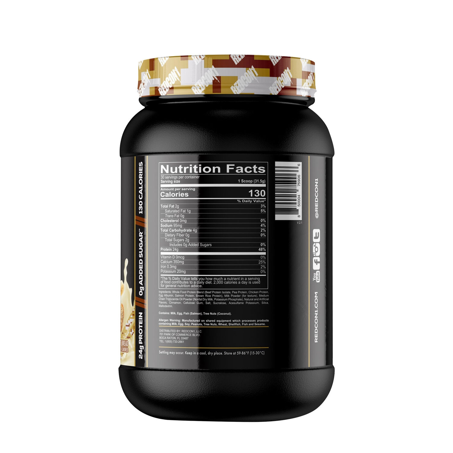 Alte ingrediente: amestec proteic din alimente integrale (izolat proteic din vita, proteina din mazare, proteina din orez brun, proteina din carne de pui, albumina din ou, proteina din somon), arome naturale si artificiale, crema de lapte (pentru textura), scortisoara, guma de celuloza, pudra din ulei din trigliceride cu catena medie (MCT), maltodextrina, sare, sucraloza, acesulfam de potasiu.