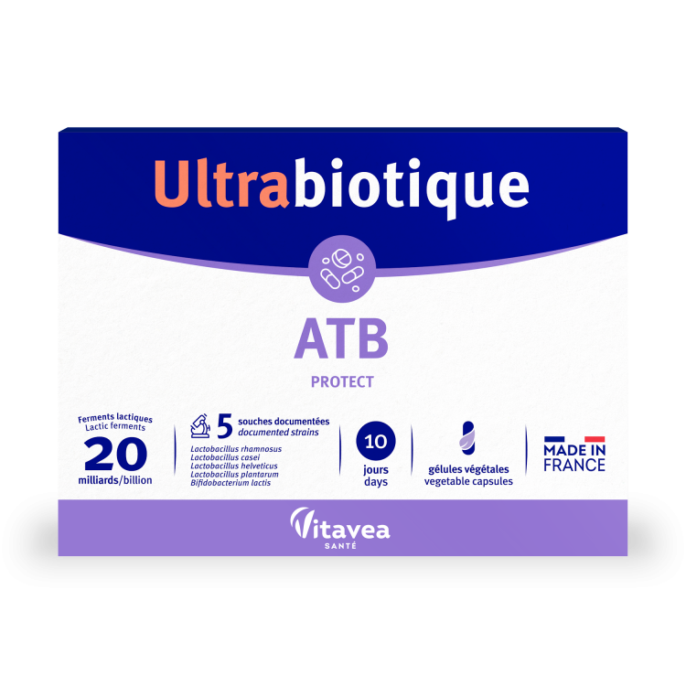 Ultrabiotique ATB Protect combină cinci tulpini de fermenți lactici pentru a păstra echilibrul florei intestinale.